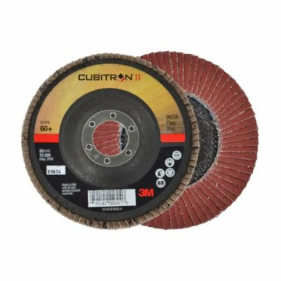 ¡Ahora puedes disfrutar del impresionante poder de corte de Cubitron™ II en un formato versátil y duradero¡ El nuevo disco de láminas 967A te permitirá pasar por una gran variedad de trabajos, incluyendo el desbaste, la retirada de cordón de soldadura, el desbarbado, y muchos más. ¡Desbaste y acabado de la superficie en un solo paso! Además, este disco es capaz de trabajar con menos presión, reduciendo la fatiga del operario. Los discos de láminas Cubitron™ II son flexibles, para adaptarse fácilmente a curvas y contornos, y son menos propensos a provocar escalones. Incluyen un refrigerante para ayudar a mantener el disco fresco en superficies sensibles a la temperatura. Gracias a su única construcción, que le permite llevar una mayor cantidad de material abrasivo, sigue funcionando mucho después de que sus competidores se desgasten por completo.